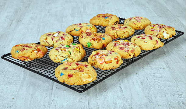 – Unsalted butter, room temperature – 185 g – Caster sugar – 1/2 cup – Brown sugar – 1/2 cup – Large egg – 1 – All-purpose flour – 2 1/4 cups – Baking soda – 1 tsp – Pinch of salt – Ready salted potato chips, lightly crushed – 1/3 cup – Pretzels, lightly crushed – 1/2 cup – Milk and white chocolate chips – 1/3 cup – Chocolate candies – 1/2 cup – Mini marshmallows – 1/3 cup – Sprinkles of choice – 1/4 cup – Candy canes, crushed – 1/4 cup