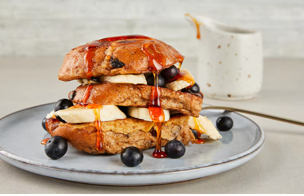 Eggs – 2 Milk – 1/2 cup Vanilla extract – 1 Tbsp Butter – 60 g Hot cross buns, halved – 4 Sliced banana, to serve Blueberries, to serve Maple syrup, to serve