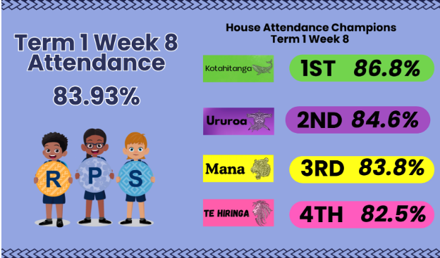 Well done to Kotahitanga who had 86.8% attendance last week and Room 32 who had the hightest attendance rate across the school with 93.5%. Our goal is to have all tamariki attending school regular which is less than five days off per term so please ensure you send your child to school all week, especially Thursday.