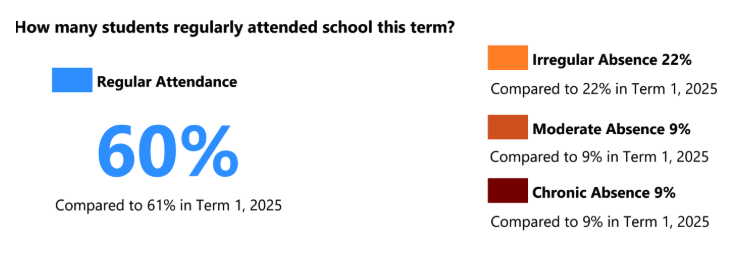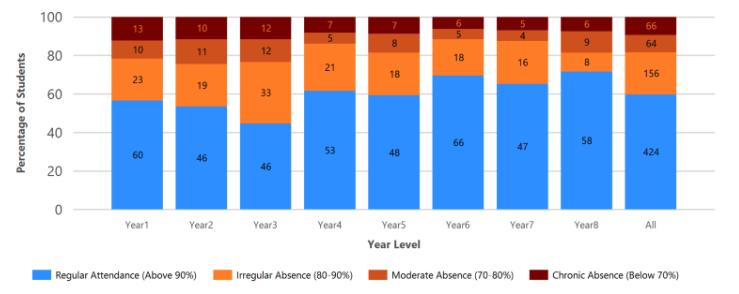 Our junior school has some work to do, particularly in Years 1–3. Our Year 3 tamariki had the lowest percentage of regular attendance, and Years 1–3 also had the highest rates of moderate and chronic absence. Building strong attendance habits early is so important, and we need whānau to work with us to ensure our youngest learners are at school every day and ready to learn.